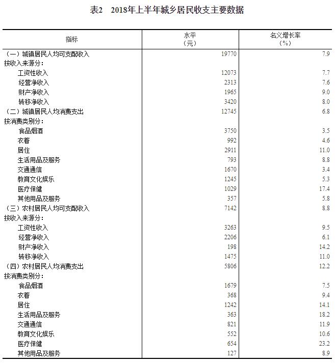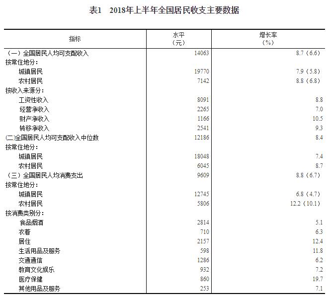 2018年上半年,全國居民人均可支配收入14063元,比上年同期名義增長8.7%,扣除價格因素,實際增長6.6%。其中,城鎮(zhèn)居民人均可支配收入19770元,增長(以下如無特別說明,均為同比名義增長) 7.9%,扣除價格因素,實際增長5.8%;農(nóng)村居民人均可支配收入7142元,增長8.8%,扣除價格因素,實際增長6.8%。