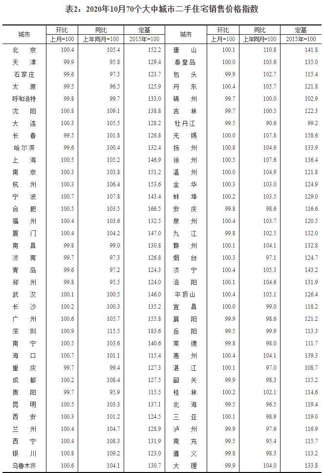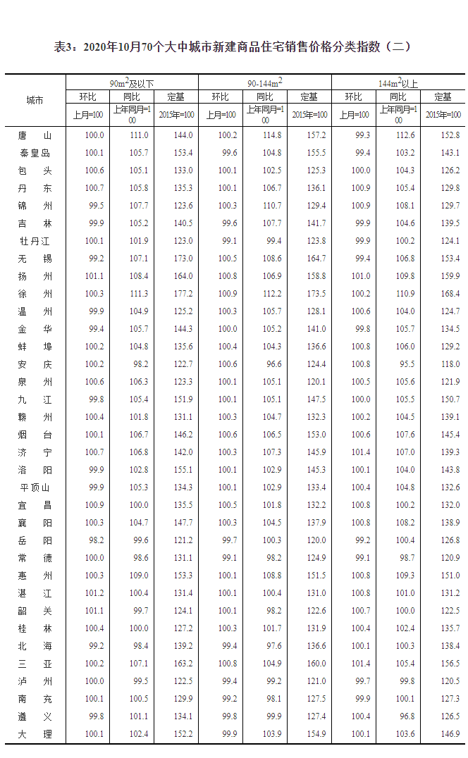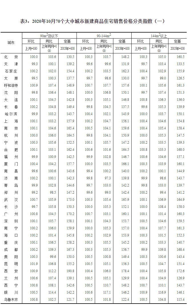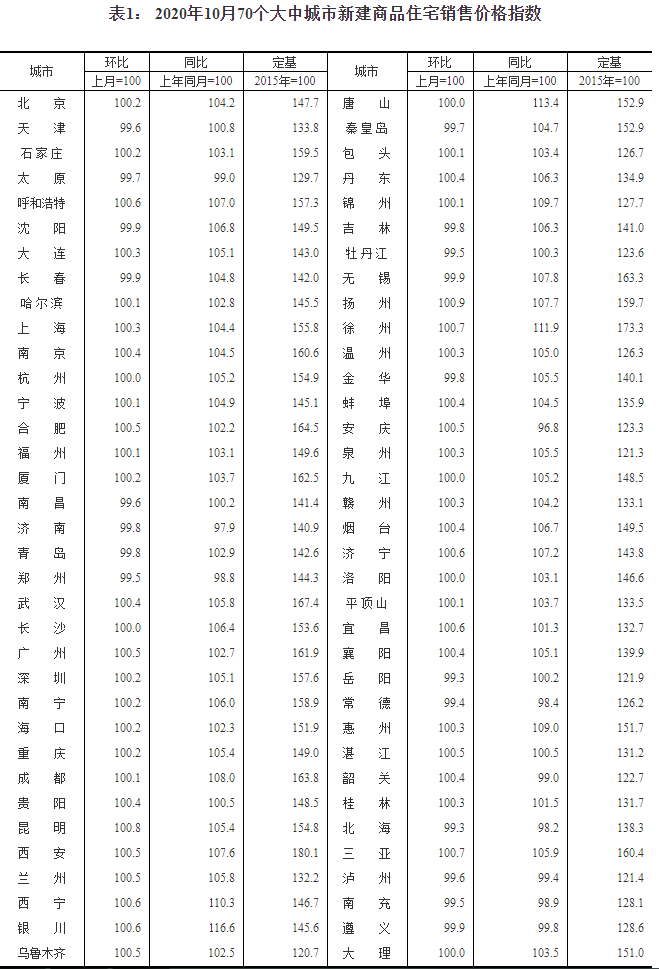 2020年10月份70個大中城市商品住宅銷售價格變動情況